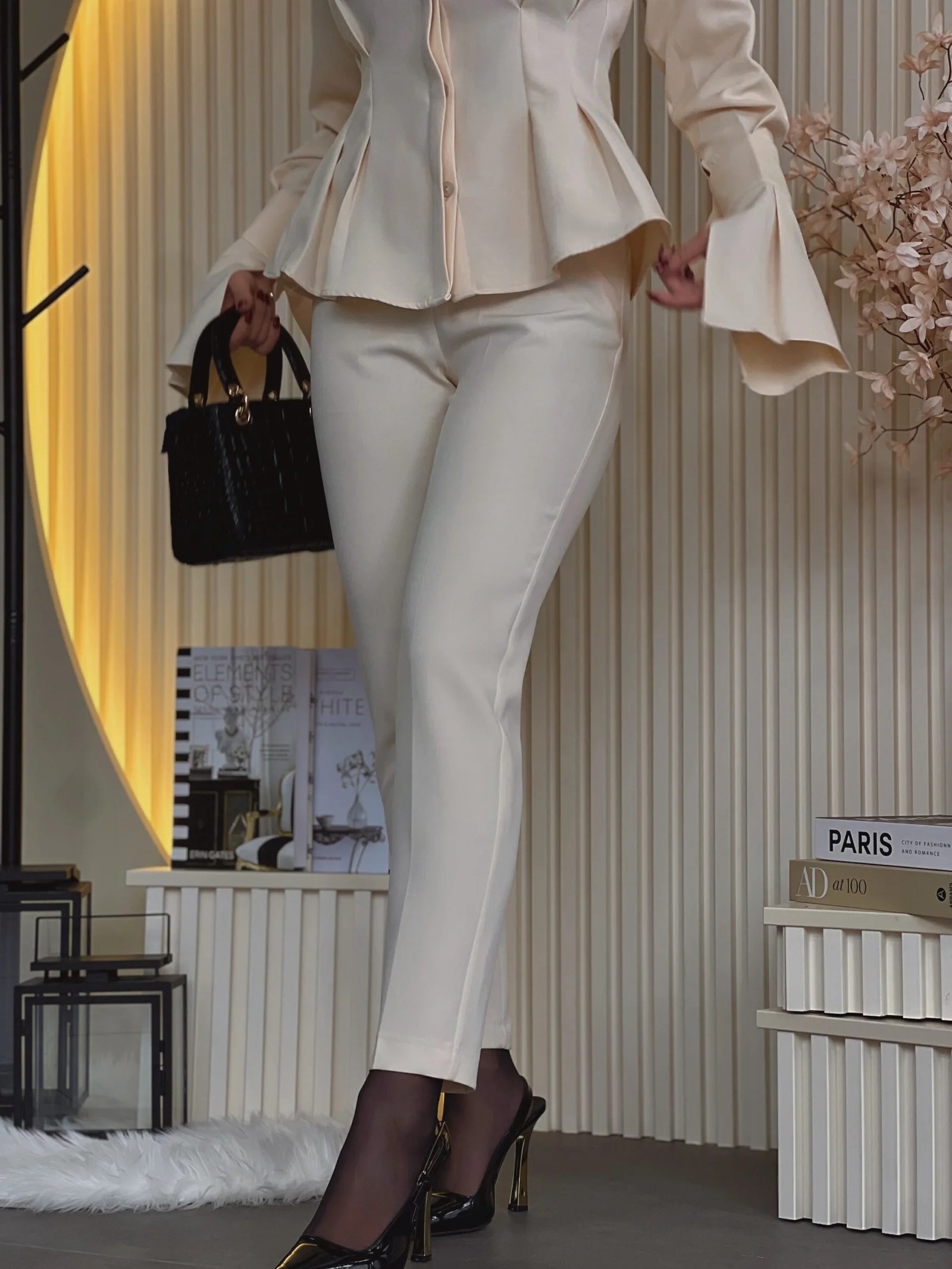 Ovaj sofisticirani komplet odiše elegancijom i stilom, idealan za svečane prilike, poslovne sastanke ili večernje izlaske. Klasično krojena košulja sa suptilnim detaljima savršeno se uklapa uz ravne, elegantne pantalone koje ističu siluetu i pružaju udobnost tokom celog dana. Napravljen od kvalitetnih materijala, komplet pruža osećaj luksuza uz maksimalnu praktičnost. Bezvremenski dizajn omogućava lako kombinovanje sa aksesoarima i obućom po vašem izboru.
