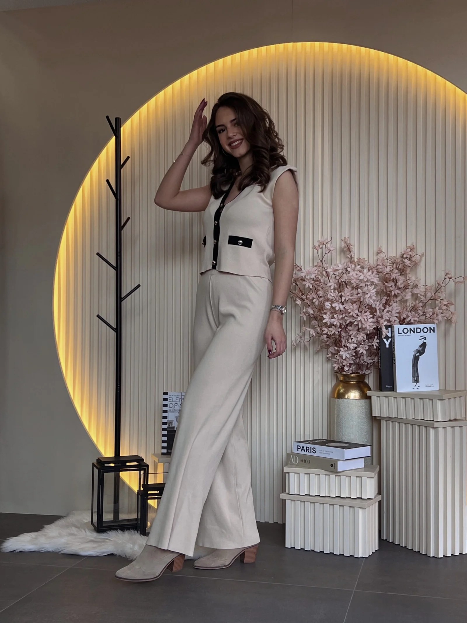 Moderan i udoban komplet od kvalitetne trikotaže u elegantnoj bež boji sa efektnim crnim ivicama. Gornji deo je prsluk bez rukava, idealan za slojevito oblačenje, dok su pantalone ravnog kroja, sa elastičnim pojasom za dodatnu udobnost. Savršen spoj sportskog i urbanog stila, idealan za svakodnevne prilike ili opuštene izlaske.