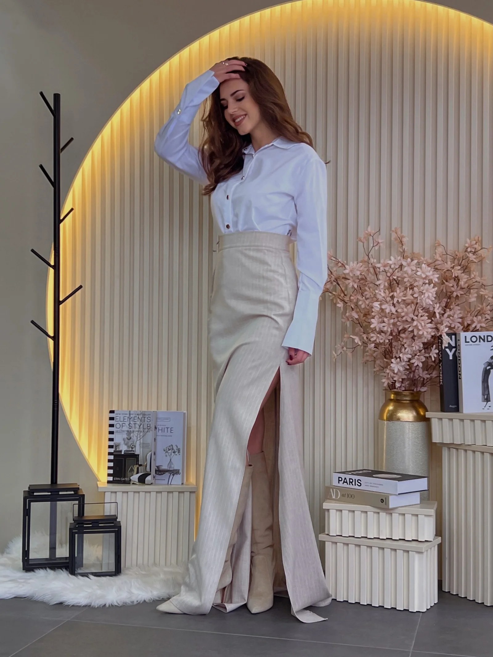 Duga suknja u bež boji sa šlicem odiše elegancijom i jednostavnošću. Napravljena je od laganog, prijatnog materijala koji nežno prati siluetu tela, dok diskretne bele prugice dodaju suptilan vizuelni akcenat bez narušavanja neutralnog tona. Šlic sa strane unosi dozu ženstvenosti i dinamike u pokretu, čineći suknju idealnom za dnevne i večernje kombinacije. Bež nijansa omogućava lako uklapanje uz razne boje i stilove, od ležernih bluza do elegantnih topova i sandala.